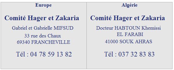 En cette période bénie de l’Aïd, le site souk-ahras.info organise une opération de collecte de médicaments au profit des enfants Hager et Zakaria. Pour tous ceux qui souhaitent participer à cette opération de bienfaisance et de solidarité, peuvent acheter avec l'argent de la Zaket, un ou plusieurs médicaments ( Voir la liste en PDF ) et les envoyer au comité « Hager & Zakaria » qui se chargera de les regrouper et de les expédier par la suite à Souk Ahras.