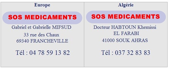 Une collecte de médicaments est organisée au profit de malades souk-ahrassiens Pour tous ceux qui souhaitent participer à cette opération de bienfaisance et de solidarité, peuvent acheter ces médicaments et les envoyer à l'une des adresses suivantes. Sachant que ces médicaments ne sont pas disponibles en Algérie.